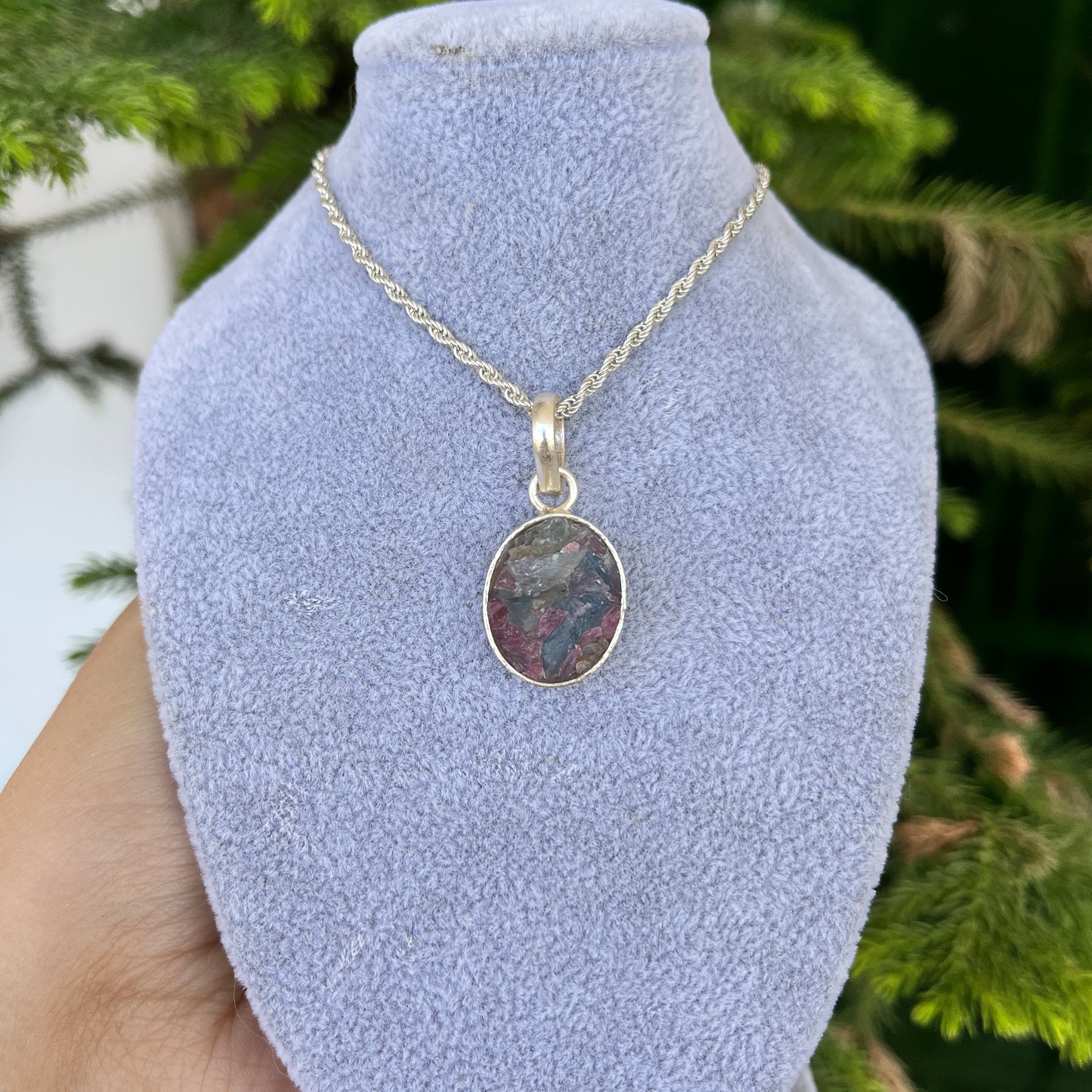 This beautiful mixed beautiful pendant has Blue Fluorite and Pink Tourmaline, Set in pure Silver (Chandi) frame! Comes along with a 18Inch delicate silver(Chandi) chain.